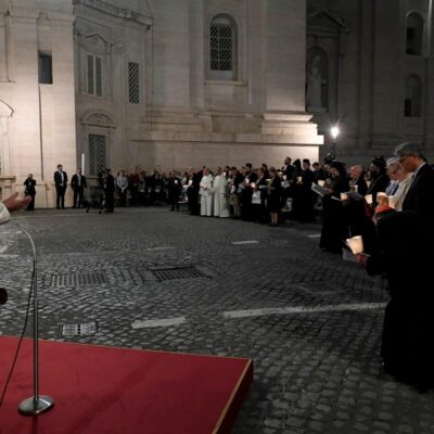 El Santo Padre presidió una oración ecuménica junto a los Padres Sinodales en la Plaza de los Protomártires Romanos, en la Ciudad del Vaticano, conmemorando